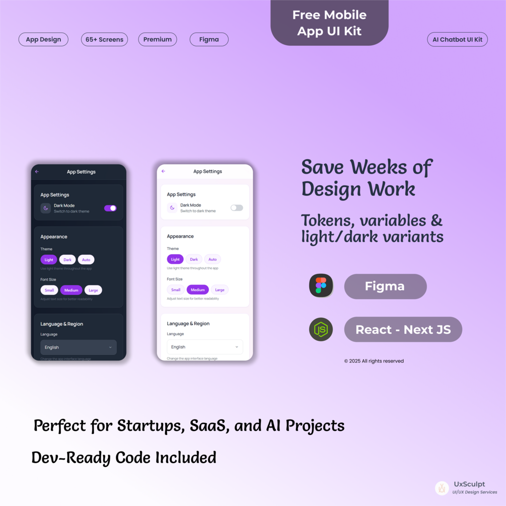 65+ Figma Screens Reusable components (buttons, chips, cards, nav, etc.) Global styles (color, text, spacing) Organized layers & systemized structure React + Next.js Code Kit Preview PNGs + Quick Start Guide