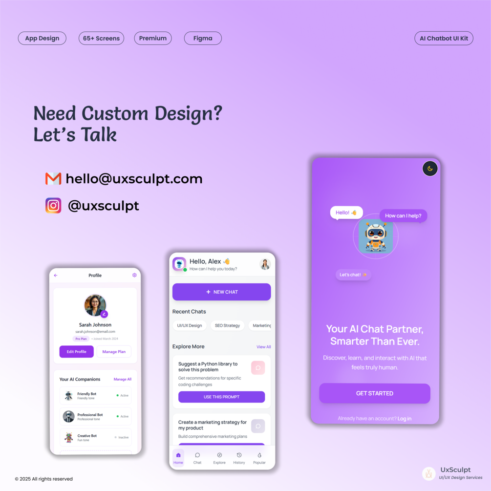 • 65+ Premium Screens (onboarding, home, chat, explore, history, settings)