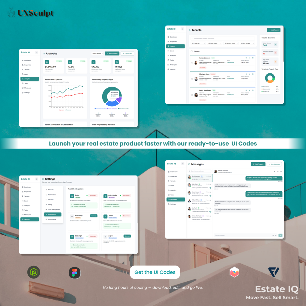 EstateIQ is a premium Real Estate WebApp UI Kit with production-ready React + Next.js code. Built for startups, agencies, and product teams who want to move fast, sell smart, and launch confidently — without spending months on design & development.