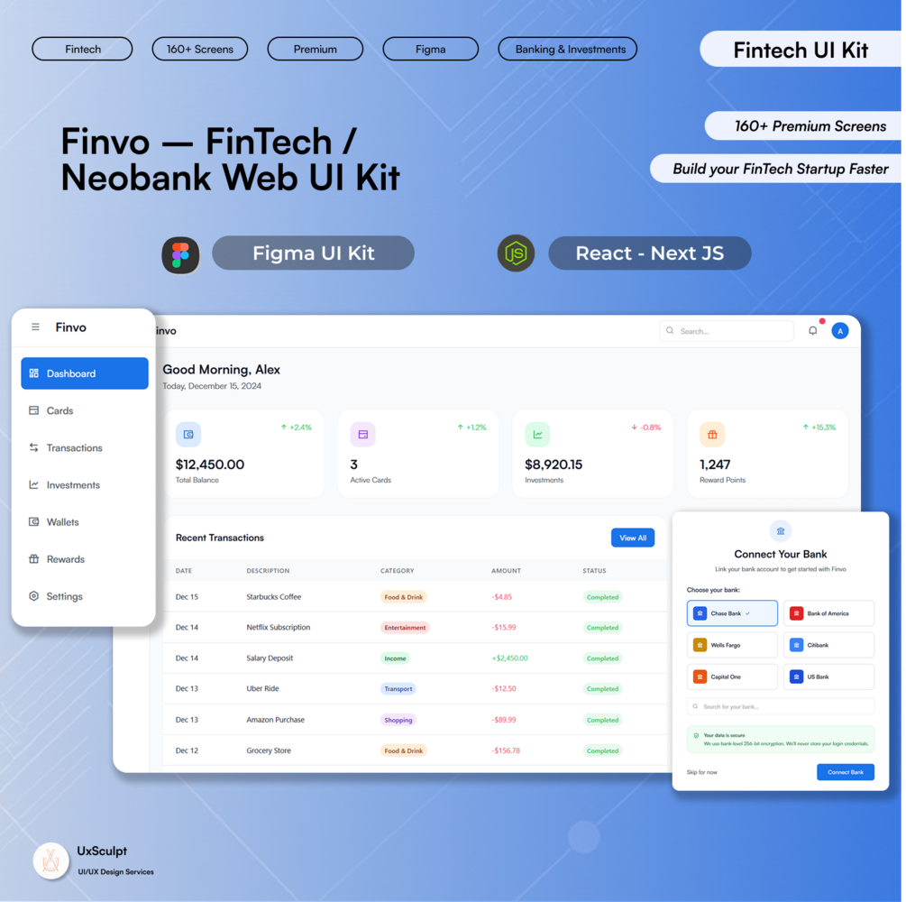 FinTech & Neobank Web Dashboard UI Kit (160+ Screens, Figma + Next.js)